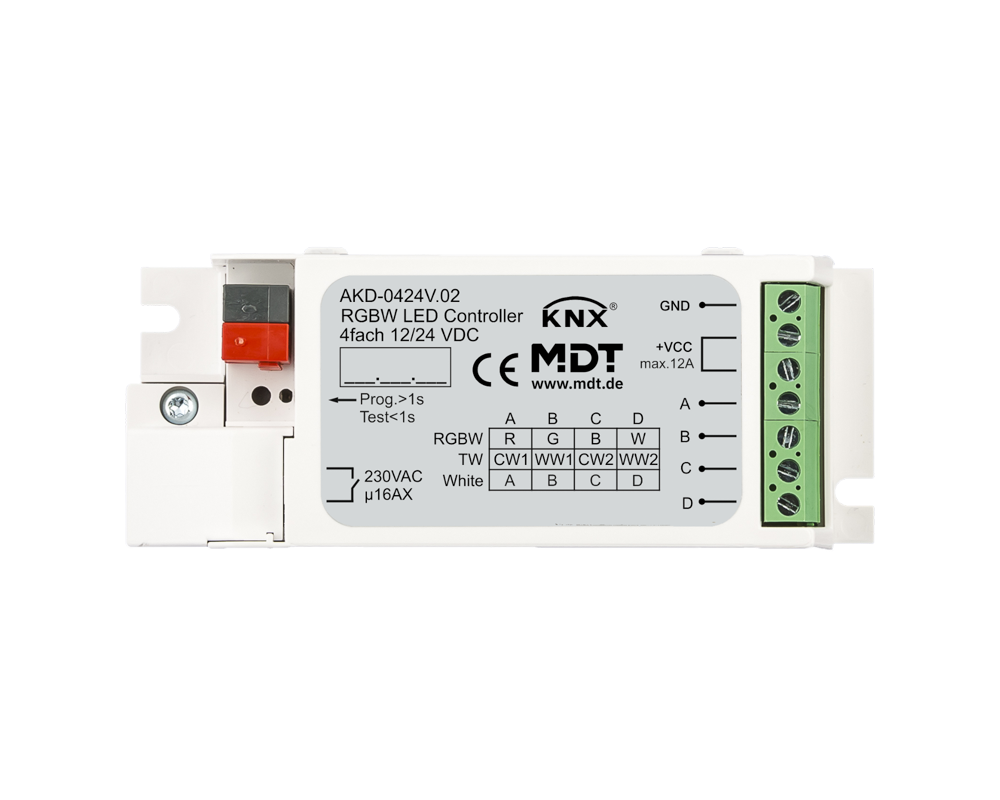 Contrôleur LED 4 sorties KNX, 3/6 A, RGBW. Pour LED 12/24 V VC (Anode commune)