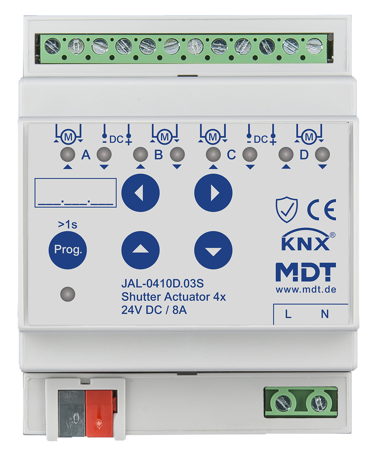 Actionneur de stores et volets roulants 4 sorties KNX, 4 modules, 8 A, 24 V CC