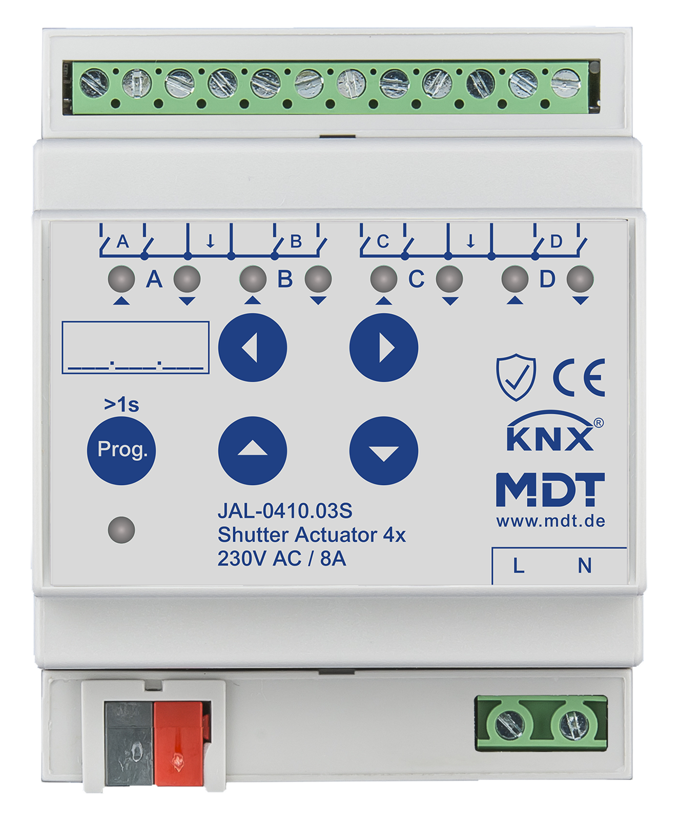 Actionneur de stores et volets roulants 4 sorties KNX, 4 modules, 8 A, 230 V CA.